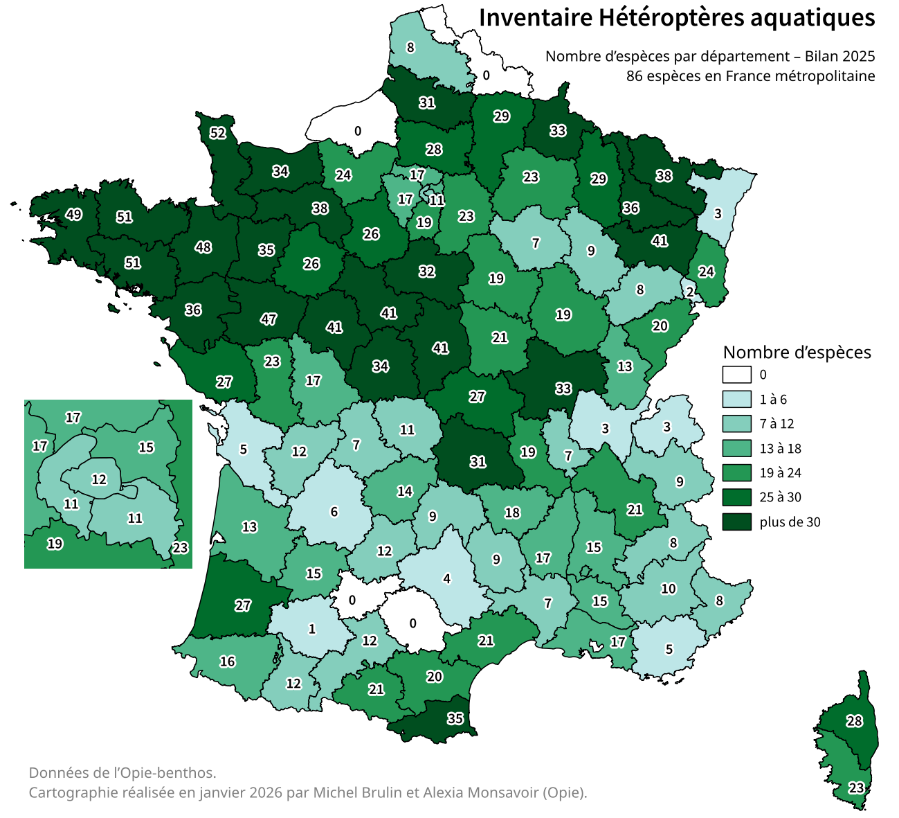 L'inventaire des Hétéroptères aquatiques et semi-aquatiques de France métropolitaine est maintenant bien consolidé dans sa démarche et bien connu, le nombre de participants dépassant largement la centaine ! Dans un premier temps l'effort avait principalement porté sur la collecte de données opportunistes, apportant une nette croissance des observations augmentant notre connaissance de la distribution nationale de certaines espèces, globalement les plus communes (Hydrometra stagnorum, Gerris lacustris, Aquarius najas, Velia caprai caprai,...). Puis sont apparues des collectes d'espèces insoupçonnées, demandant des vérifications, des approfondissements. Dès 2022, les progrès de l'inventaire depuis son lancement apparaissaient très clairement dans une large moitié nord de la France, confirmés en 2024.